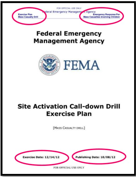Note: The recorded Exercise Date on the document’s title page is 12/14/12, and the Publishing Date is 10/08/12, two months prior to the actual event. Also, the heading on the top of the title page clearly identifies the drill’s target casualty population: